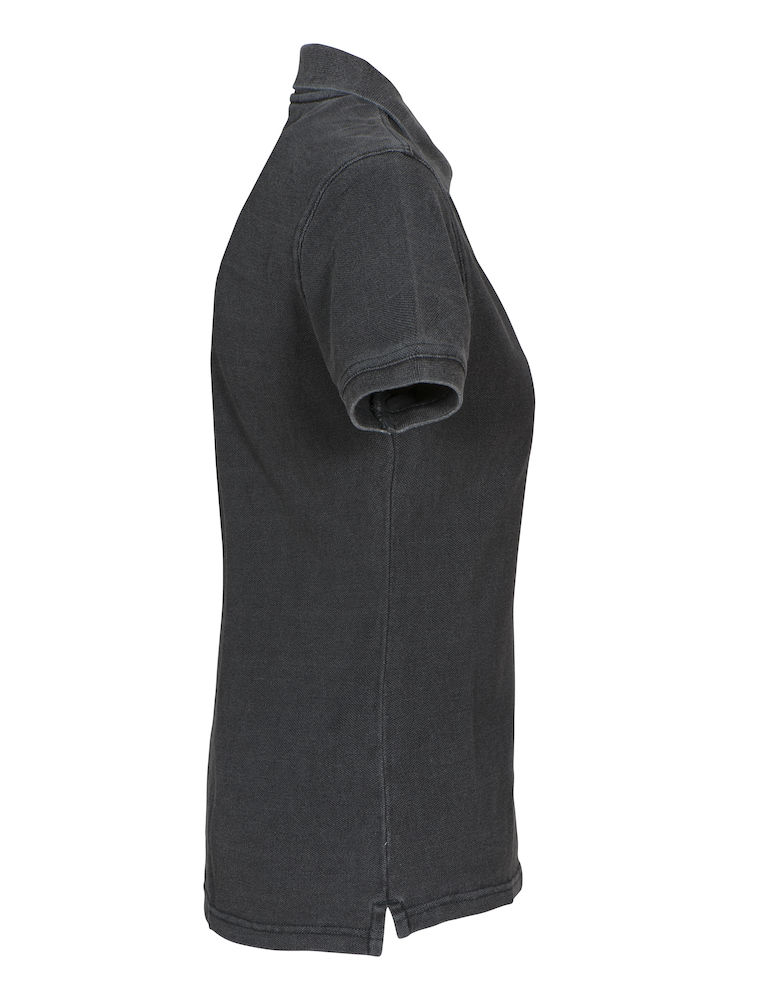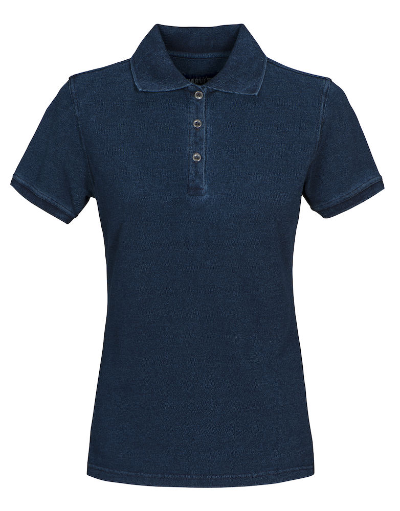 Tricou polo cu aspect de denim uzat. Model dama cambrat. Guler si mansete canelate. Nasturi metalici la fanta. Fante laterale.